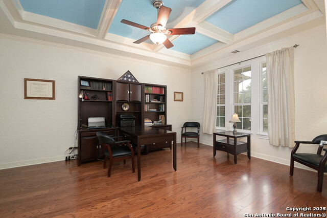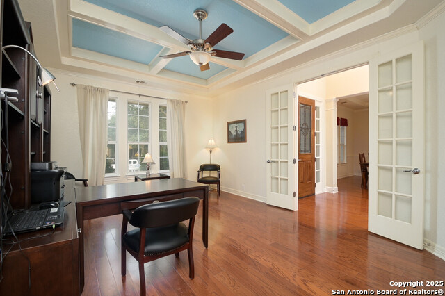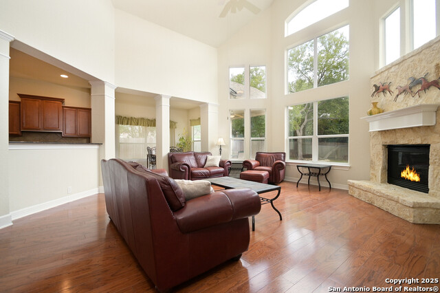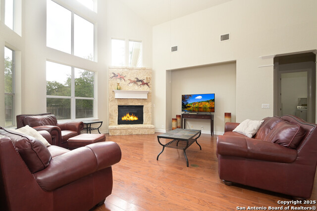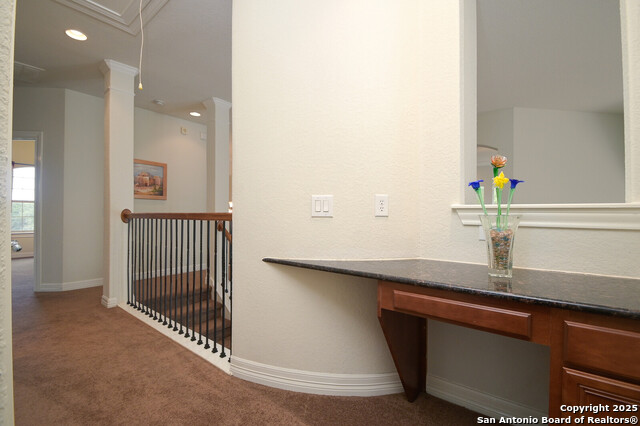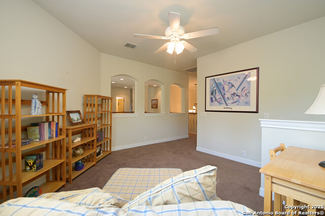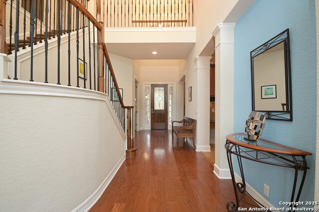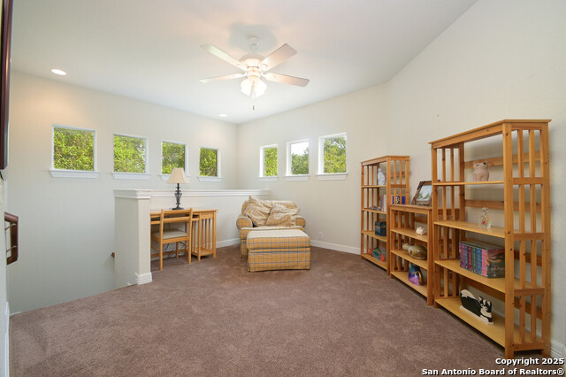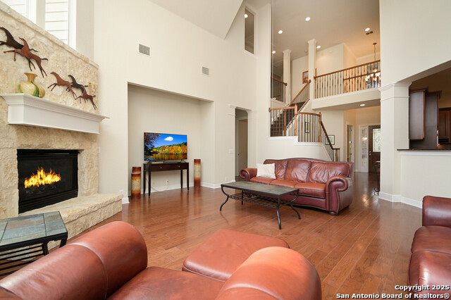 This Captivating Home is Nestled in a Desirable Gated Community of Alamo Ranch. An Intimate Setting, Woodbury Grant Boasts Roomy, Tree-Filled Lots, Wide Streets & Texas-Sized Pulte Homes. High Ceilings, a Thoughtful Design & Plenty of Windows are a Few of the Home's Notable Features. The Downstairs Owner's Suite has Double Walk-In Closets, Separate Vanities & a Garden Tub for Two. Use the Sprawling Office to Work from Home or Creatively use it as an In-House Lounge. Two Staircases Adorn this Lovely Home!!!One Staircase Ends in the Upstairs Suite Which Includes a Living Area, Bedroom with Large Balcony & Full Bath. Head Across the Catwalk to find the other Staircase Along with Two Bedrooms, Humongous Loft/Living Area and Full Bath!! What an incredible design!! If you Love Trees in a Private Setting on a .31 Acre Lot. Roof replaced 2023, Water softener replaced 9/2025, 2 Hot Water Heaters replaced 3 yrs ago. Do NOT Delay. This Unusual Floorplan will NOT Last. OWNER WILL CONSIDER $4,000 TOWARDS LANDSCAPING.